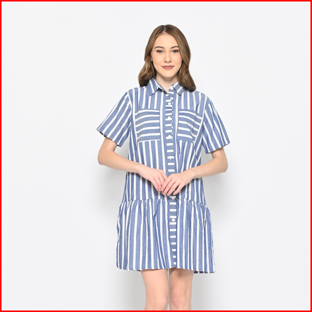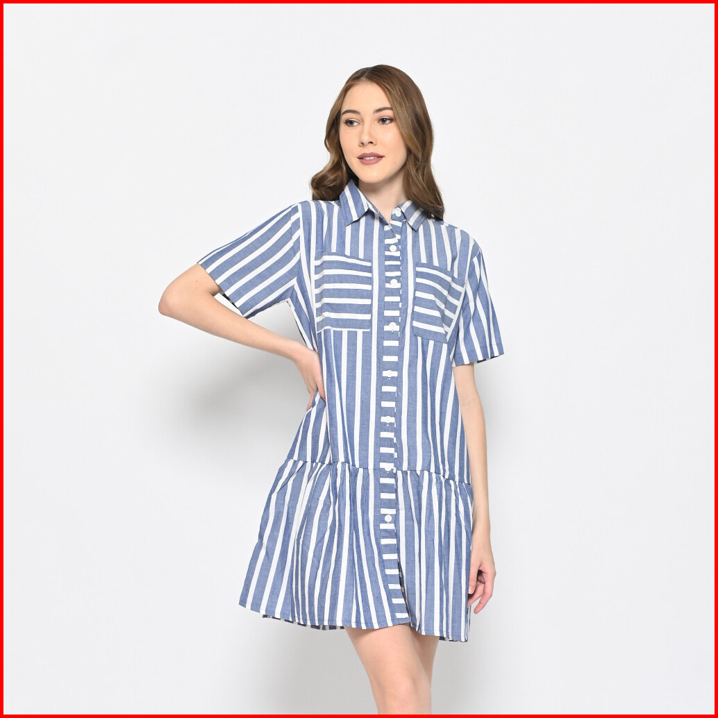Queentin Ruffle Dress Wanita 0236 Katun Yarn Dyed Motif Salur Lengan Pendek