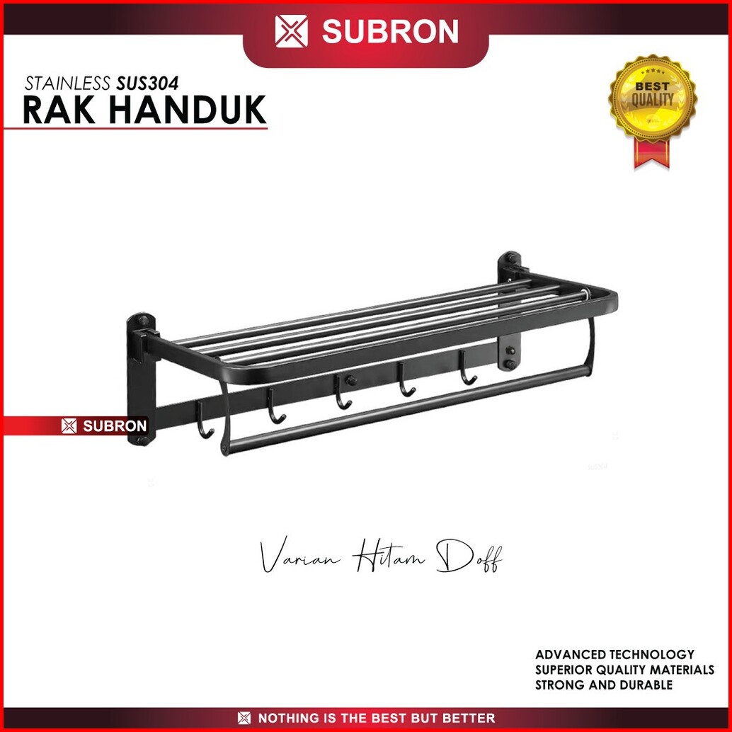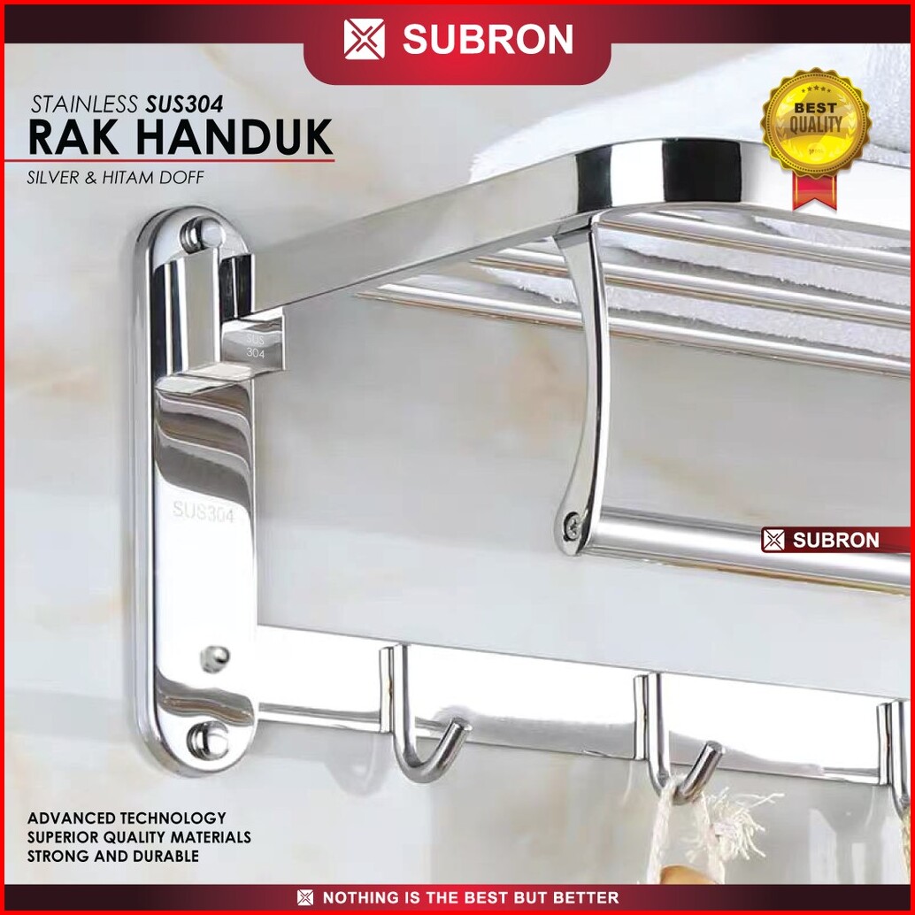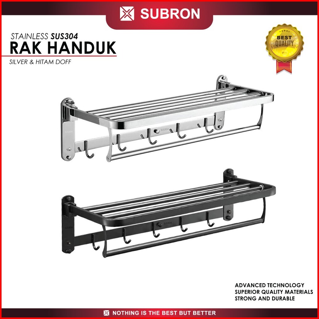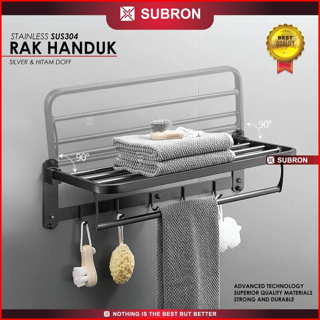 Subron Rak Tempat Handuk Lipat Stainless Sus304 Silver Hitam Doff 5 Kait Hook Gantung Kamar Mandi
