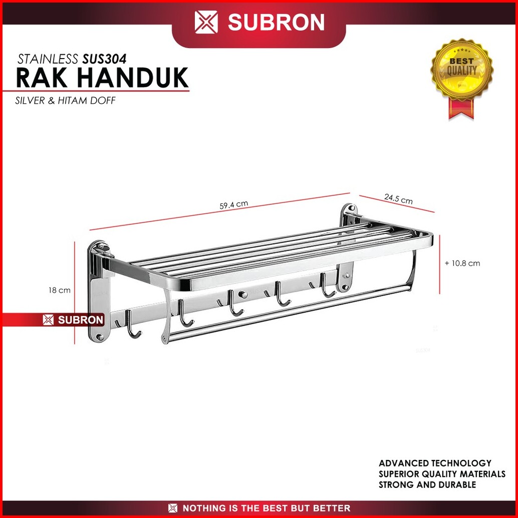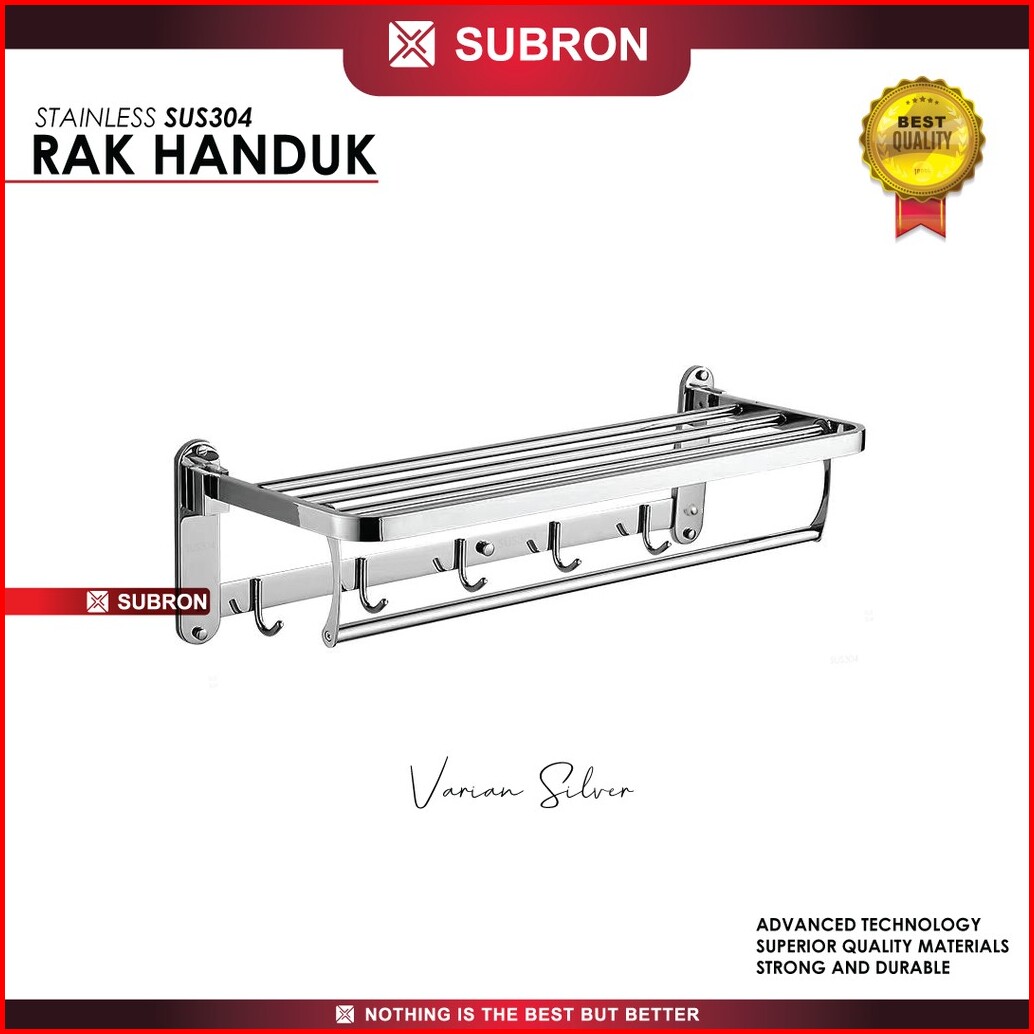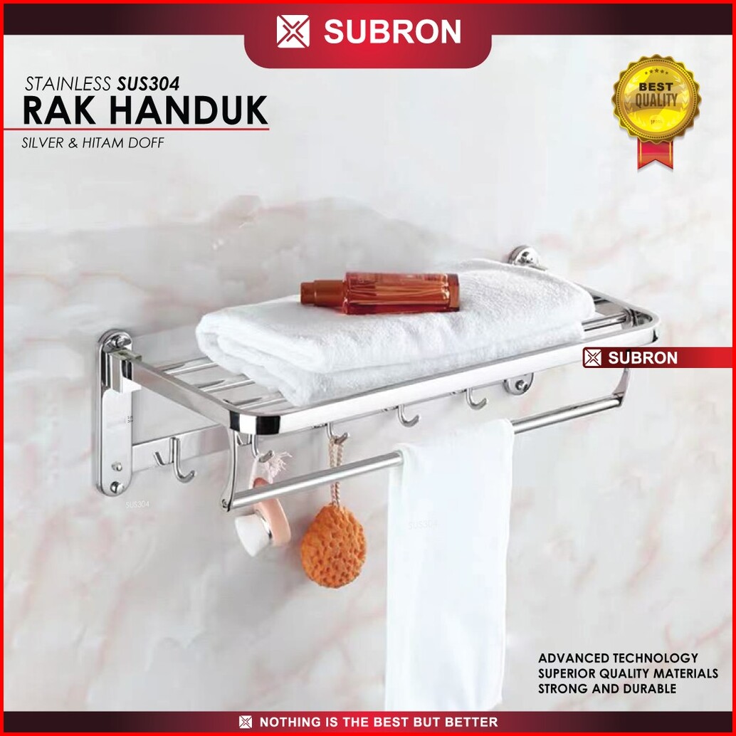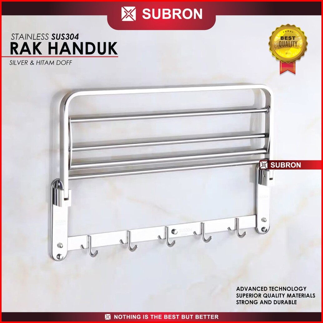 Subron Rak Tempat Handuk Lipat Stainless Sus304 Silver Hitam Doff 5 Kait Hook Gantung Kamar Mandi