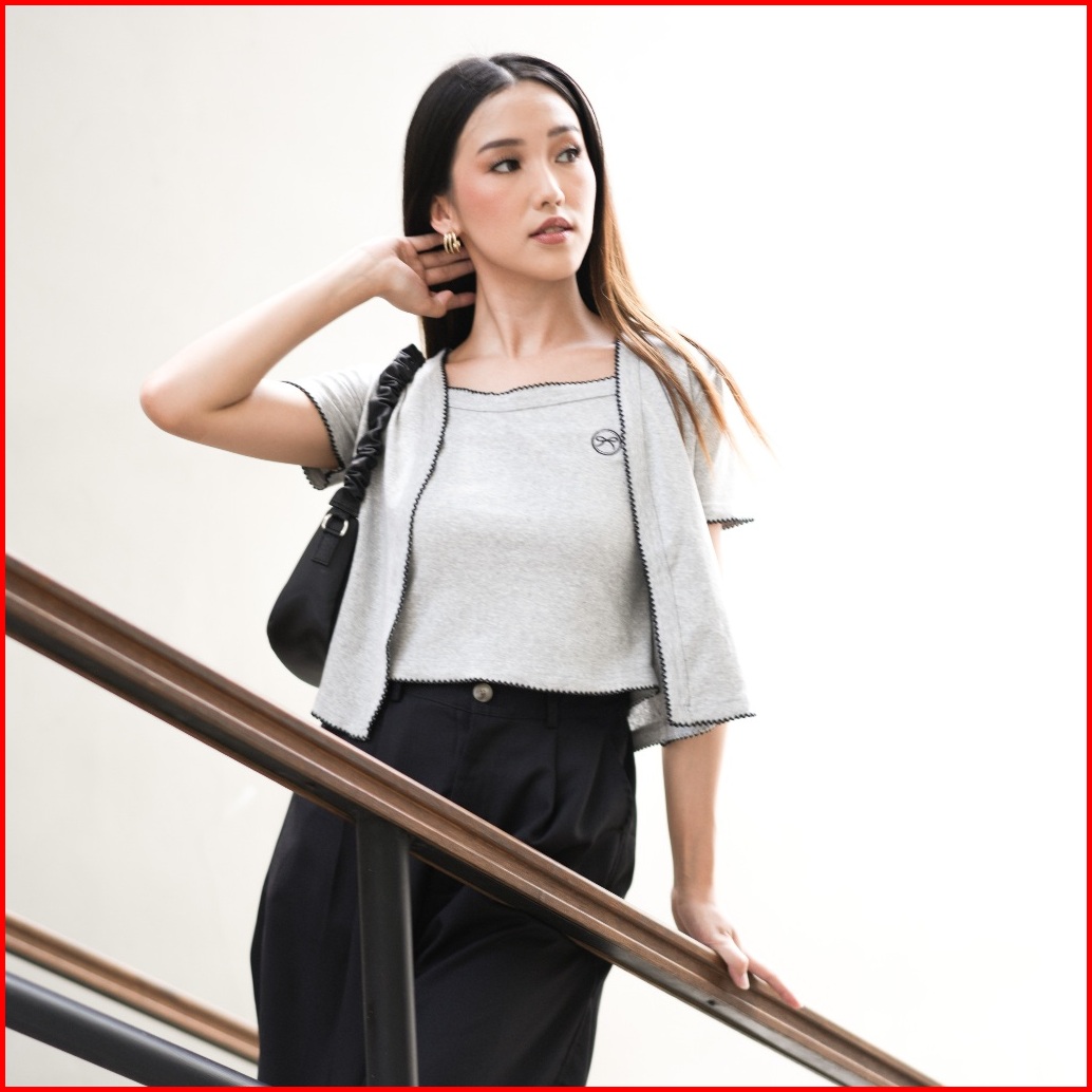 Queentin Tanktop Cardigan Wanita Crop Set 0682 Katun Spandex Polos Lengan Pendek