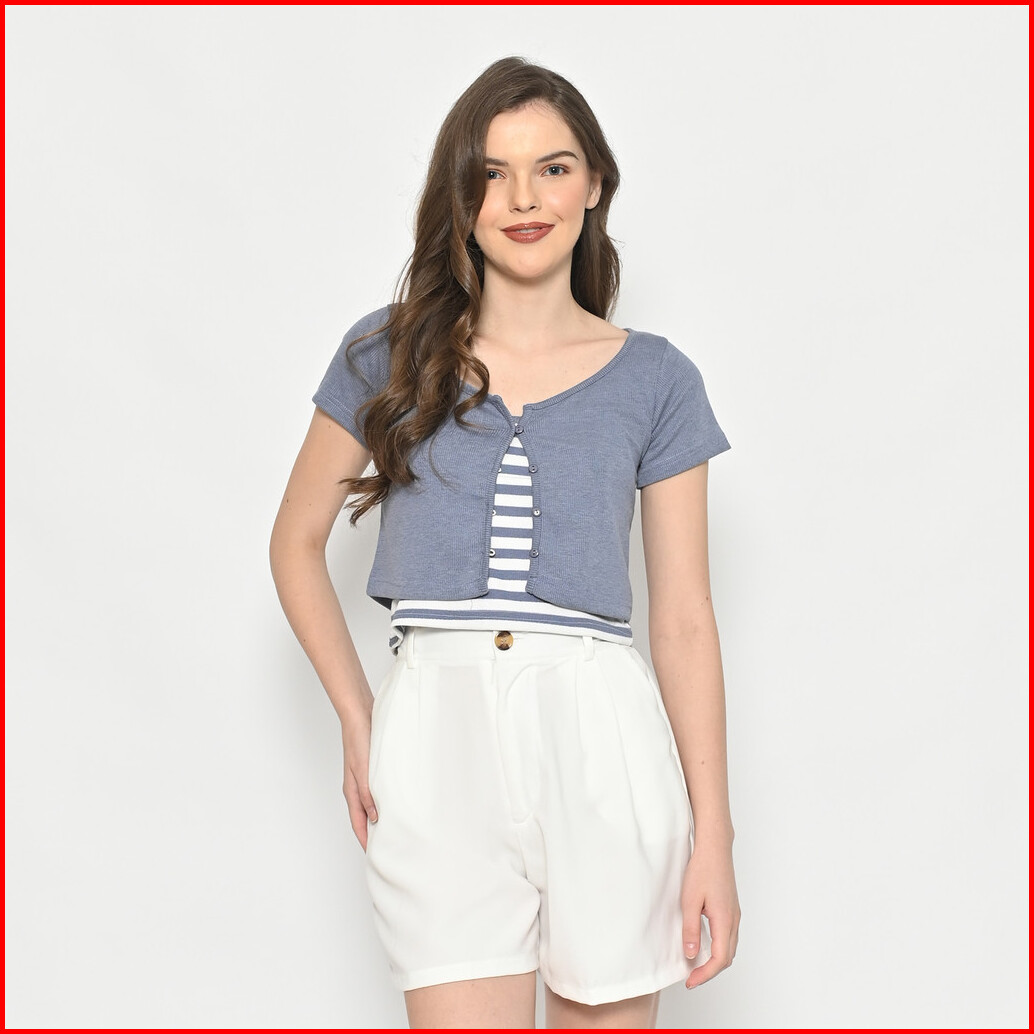 Queentin Tanktop Cardigan Wanita Crop Set 0680 Stretch Yeona Knit Polos Salur Lengan Pendek