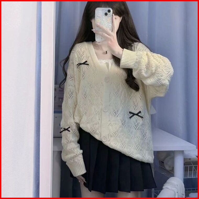 Yiyi Girl Cardigan Rajut V-neck Lengan Panjang Warna Solid
