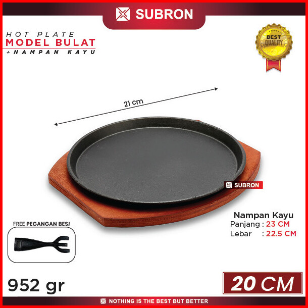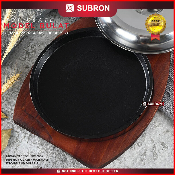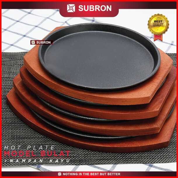 Subron Hot Plate Model Bulat Nampan Kayu Piring Hitam Steak Bulat Free Pegangan Besi 18cm 20cm 22cm 24cm