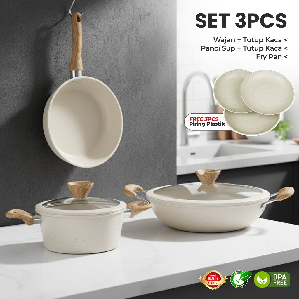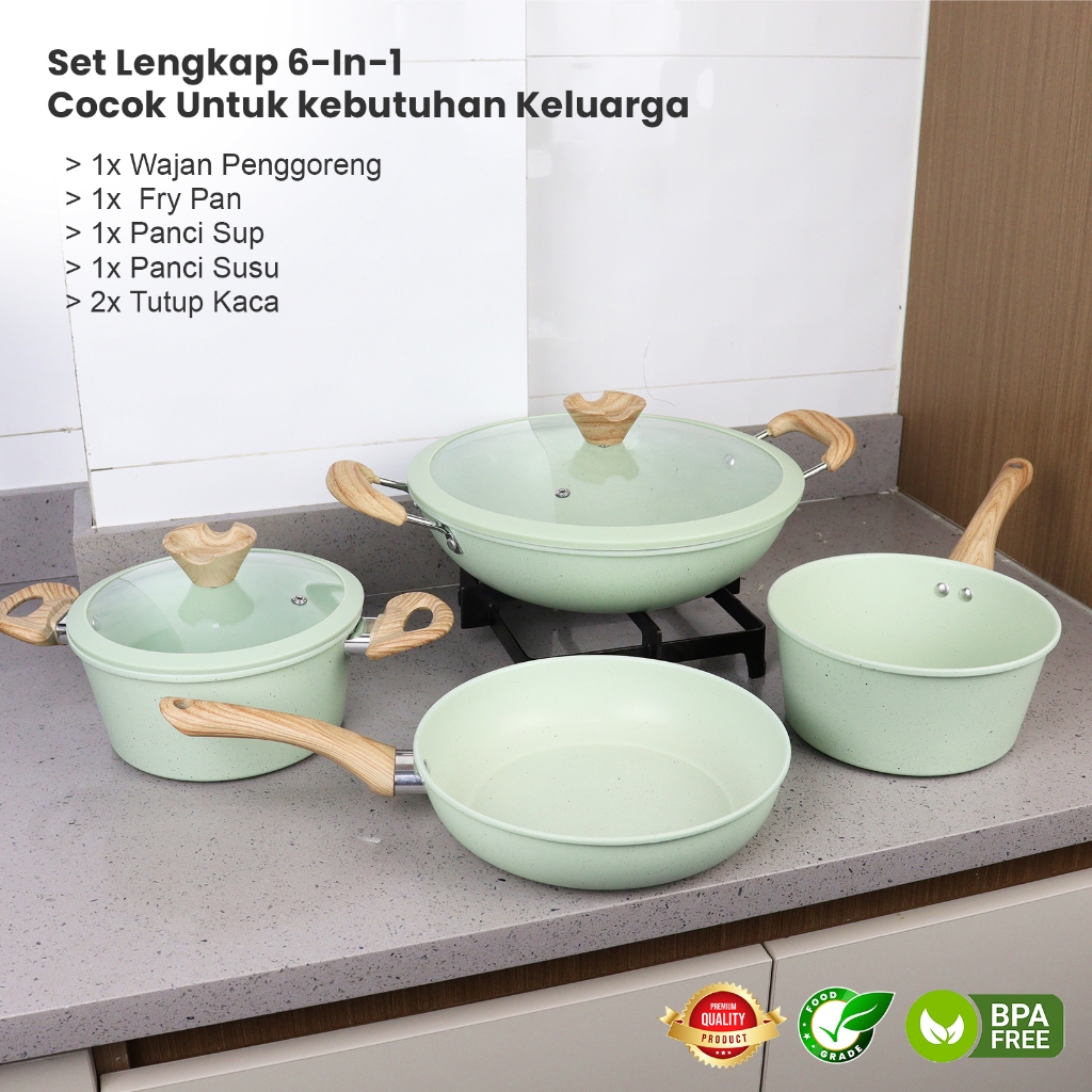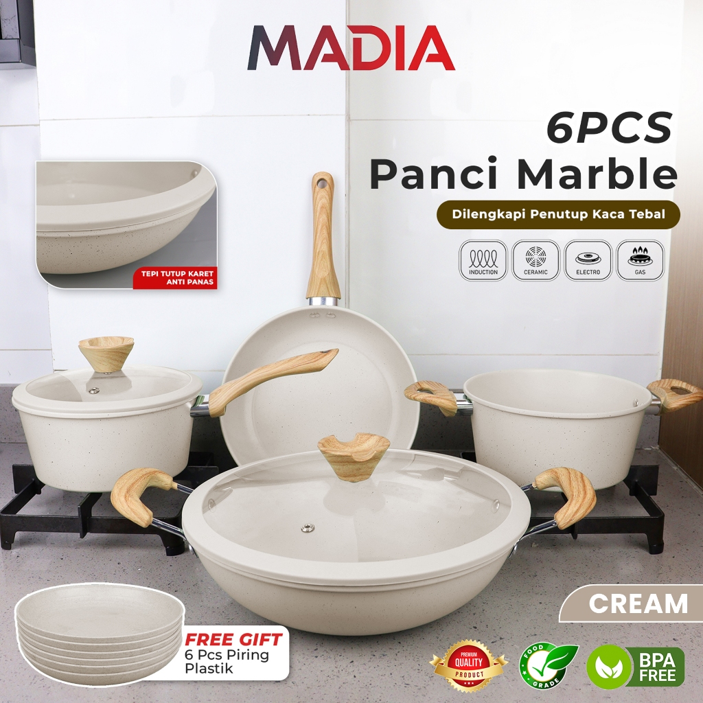 [FREE PIRING] Madia Set Panci Marble 6 Pcs Non-Stick - Panci Wajan Serbaguna Estetik untuk Semua Jenis Kompor