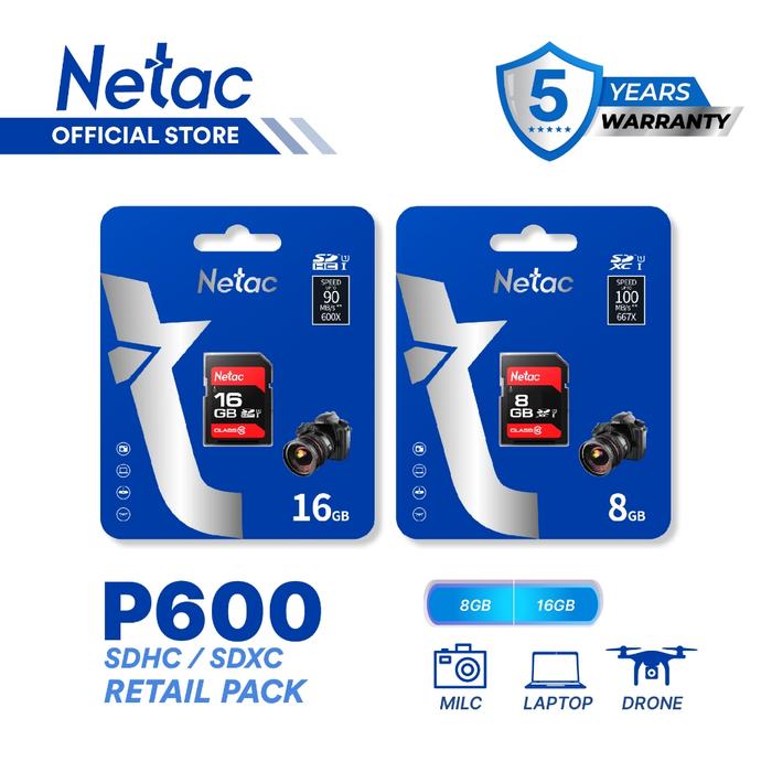Netac P600 SDHC/SDXC 8GB/16GB/32GB/64GB/128GB U1/Class10 Memory SD Card up to 90MB/s Retail Pack Fit for SLR Camera & DV