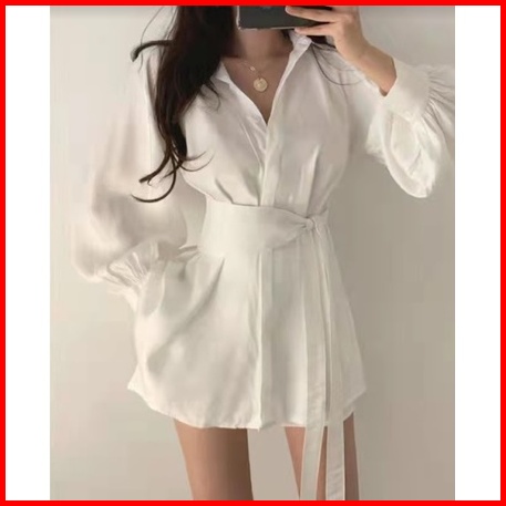 Long Puff Sleeve A Line Button Front Tie Shirt Dress 1456 S-xl