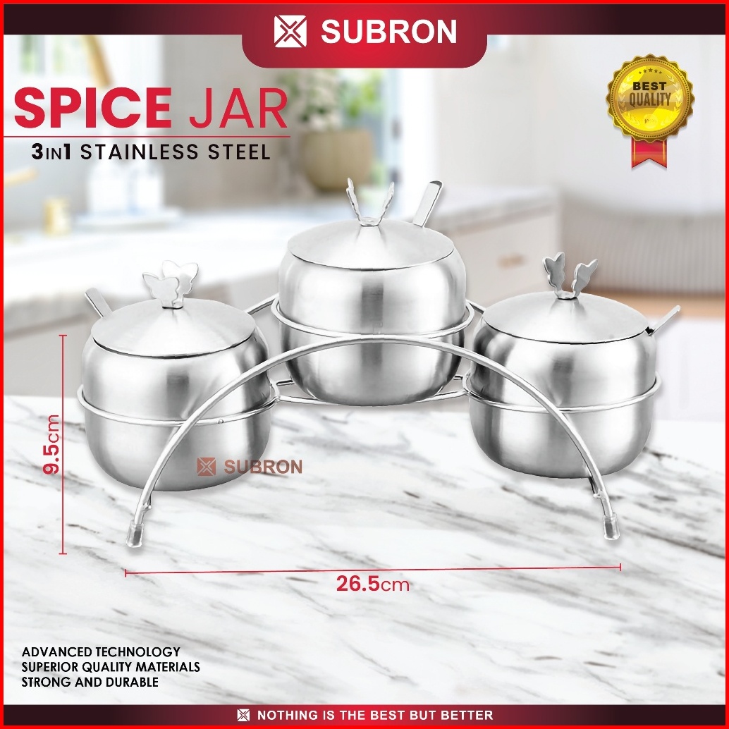 Subron Tempat Peyimpan Bumbu 3in1 350ml Set Rak Dan Sendok Stainless Wadah Storage Garam Gula Kopi Seasoning Jar Multifu