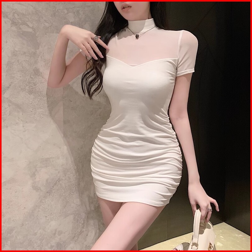 Newlan Qz130 Mini Dress Round Neck Transfaran Dress Bodycon Slim Bell Sleeve Wanita Elegant Sexy Lengan Pendek Wanita Ga