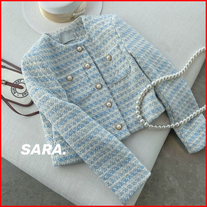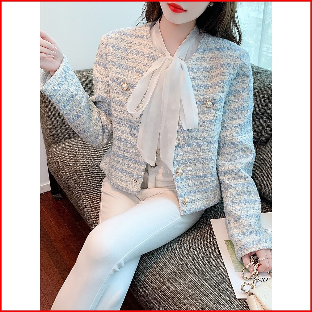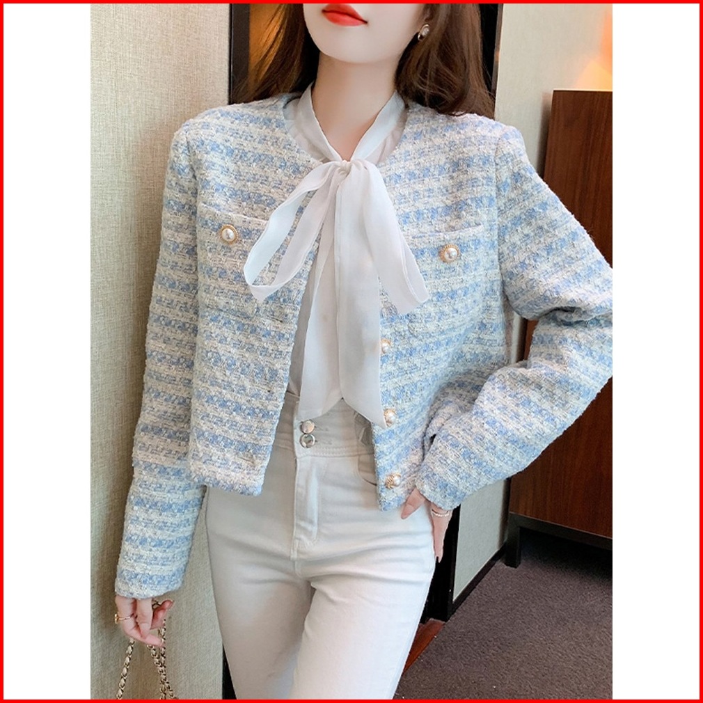 Blazer Biru Tweed Blazer Wanita Crop Top Korean Style M601
