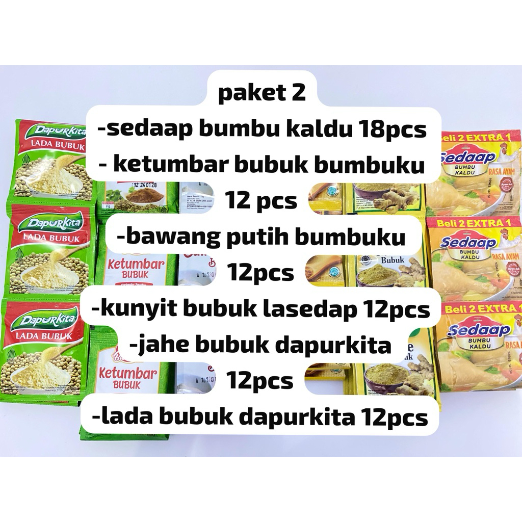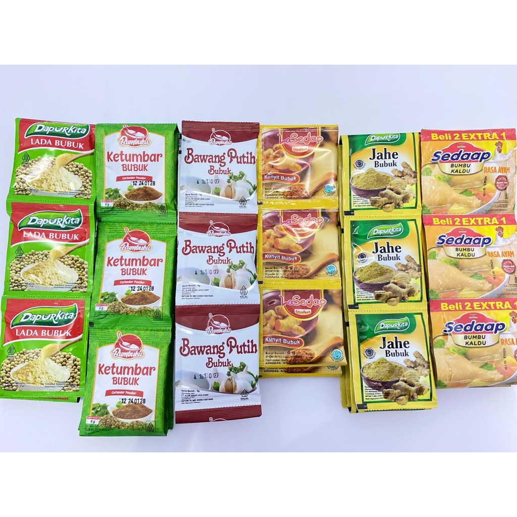 Paket Hemat Bumbu Dapur Per Renceng Sedaap Bumbu Kaldu, Bumbuku Ketumbar Bubuk, Desaku Kunyit Bubuk, Bumbuku Bawang Puti