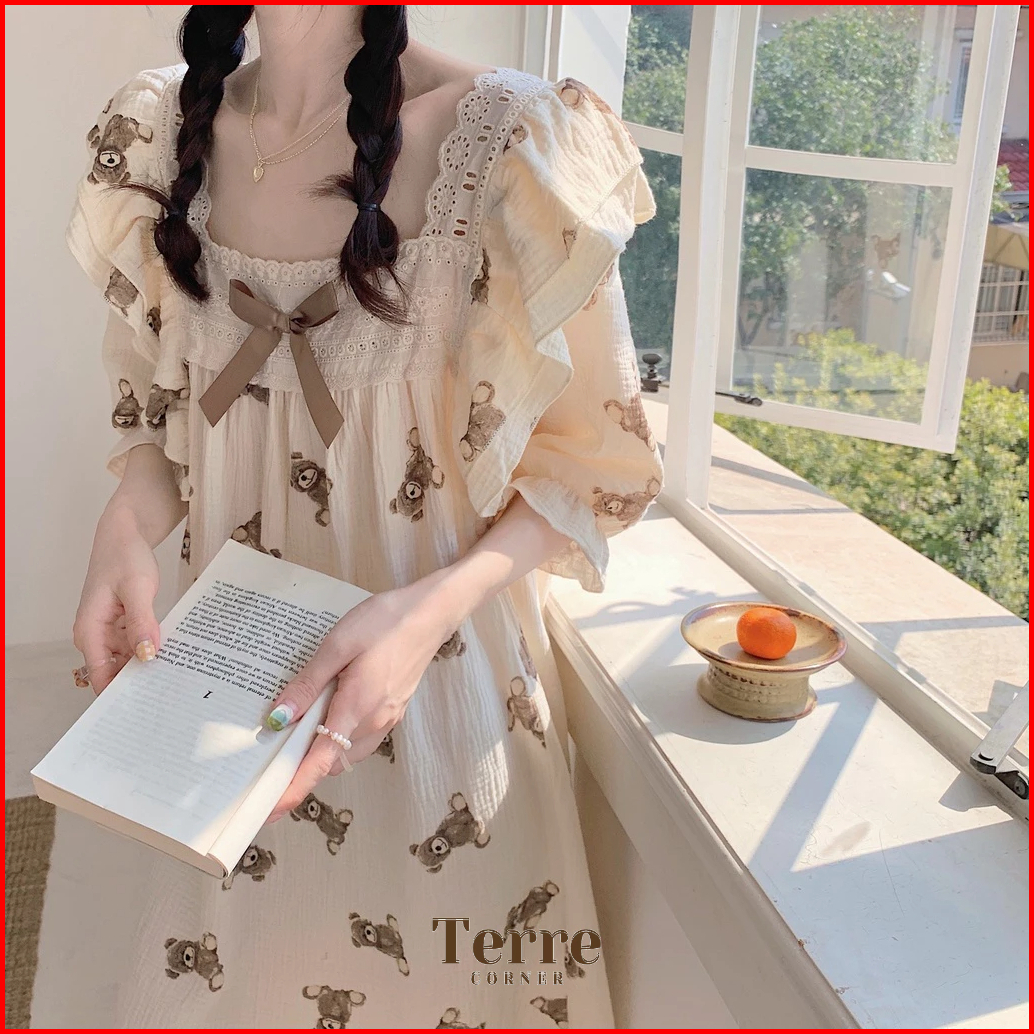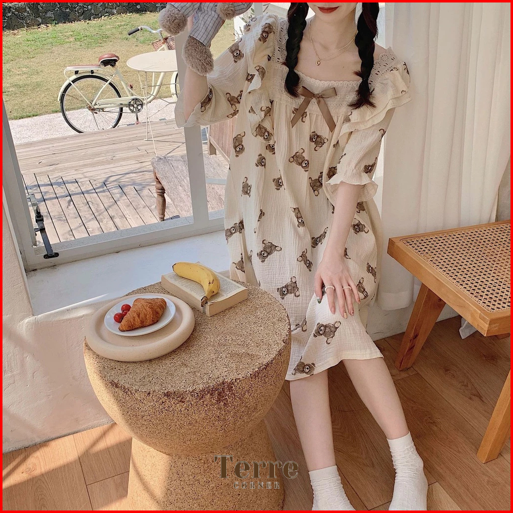 Daster Aesthetic Baju Tidur Piyama Wanita Murah Kyu Ri Sleepwear Rok Tidur Import Korean Style Motif Bear Vintage Kekini