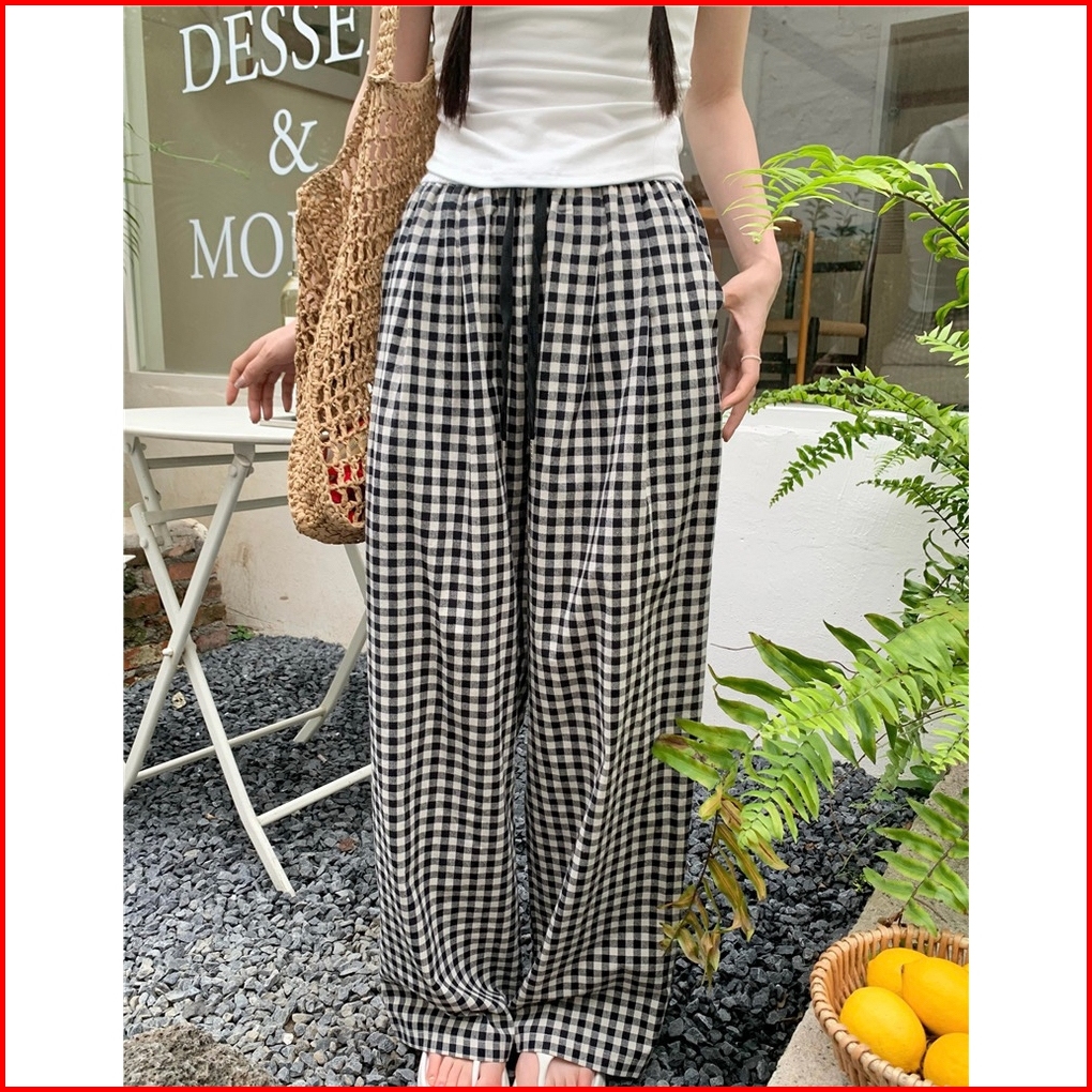 Riod Aoer Celana Panjang Lebar Kotak-kotak Biru Untuk Wanita Musim Panas Tipis 2025 Baru Kecil Pinggang Tinggi Longgar L