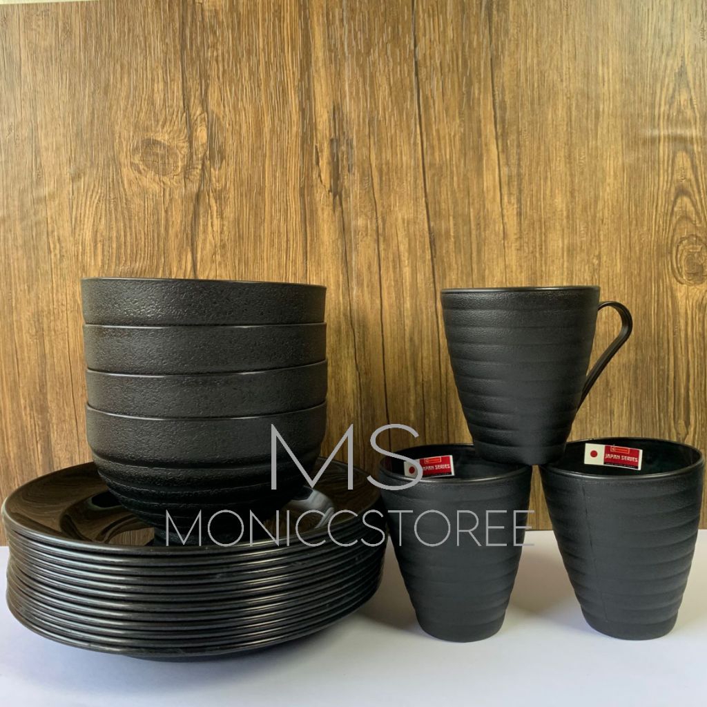 Set Alat Makan Ramen Jepang 6 / 12 Pcs | Piring Mangkuk Gelas Tebal | Full Black Elegan | Cocok untuk Cafe