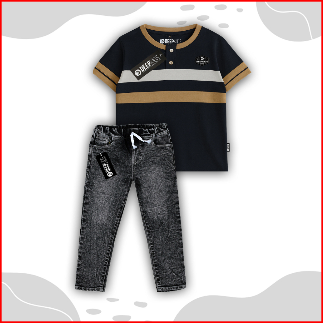 Deepkids Setelan Anak Laki Laki Kaos Kerah Kancing Celana Jeans Panjang Bahan Cotton Combed 24s Denim Jeans Tebal Usia 1