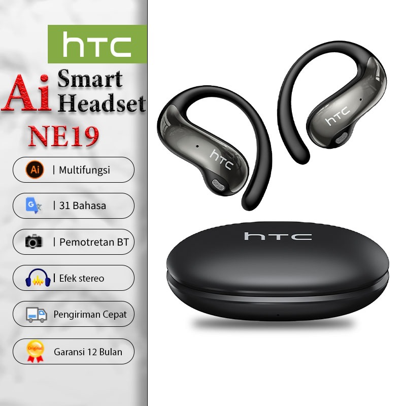HTC NE19 Headset Bluetooth Terbuka Pintar, AI Peredam Bising, TWS Bass Berat, OWS, Bluetooth 6.0 Nirkabel Earphone IPX5