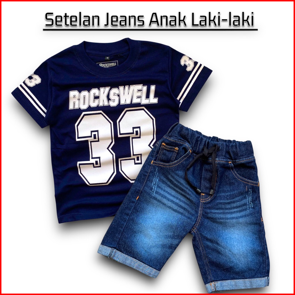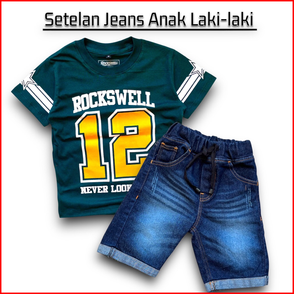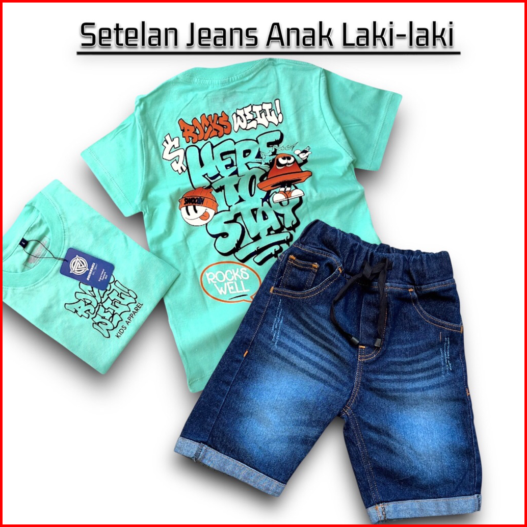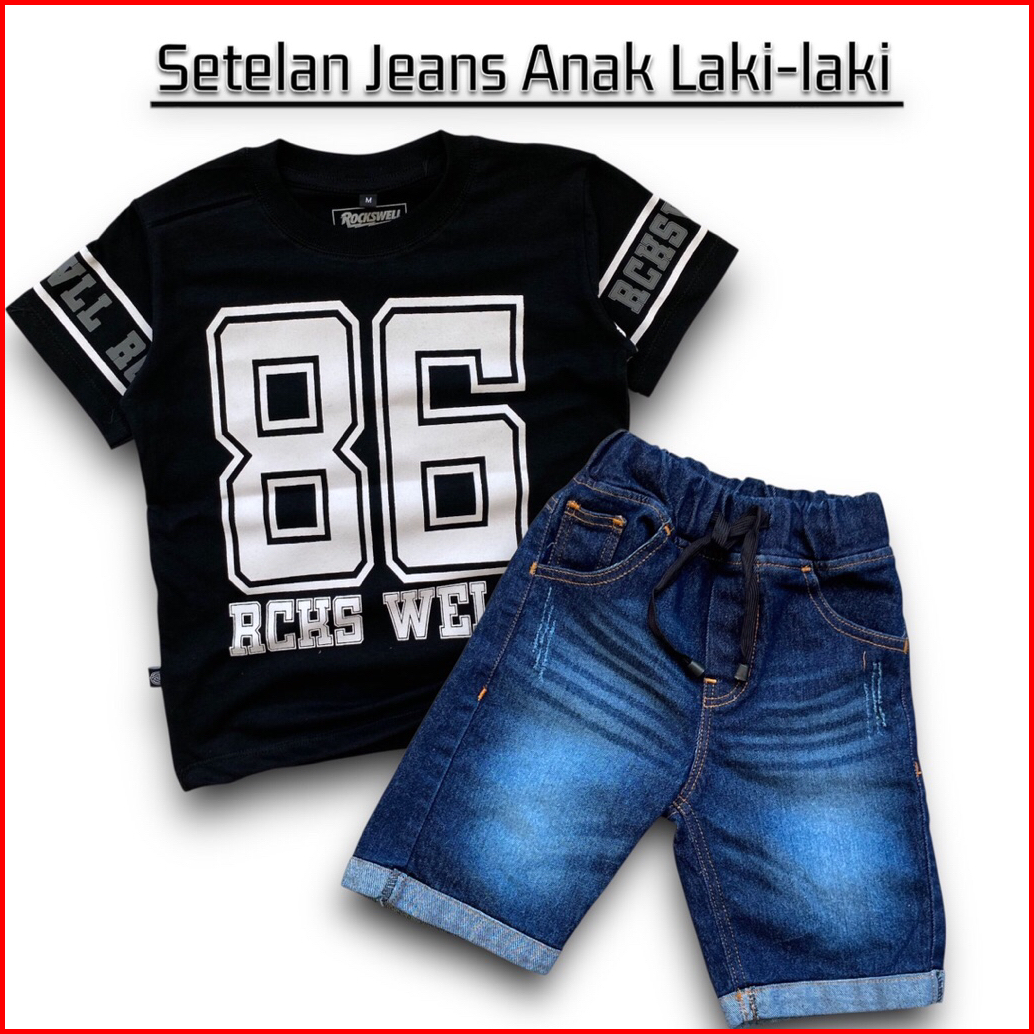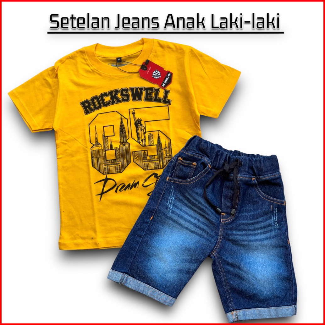 Setelan Baju Kaos Anak Dan Celana Pendek Jeans Usia 4-15 Tahun