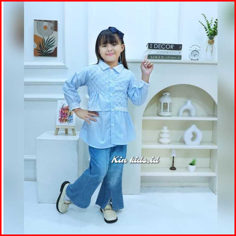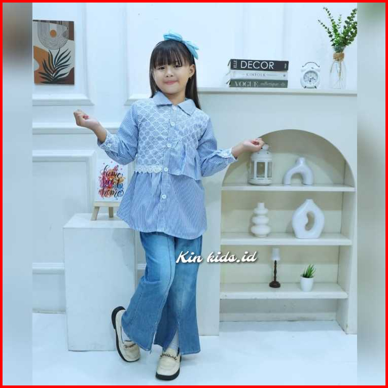 Setelan Anak Perempuan 4-12 Tahun Baju Kemeja Salur Dan Celana Jeans Cutbray - Kin Kids.id