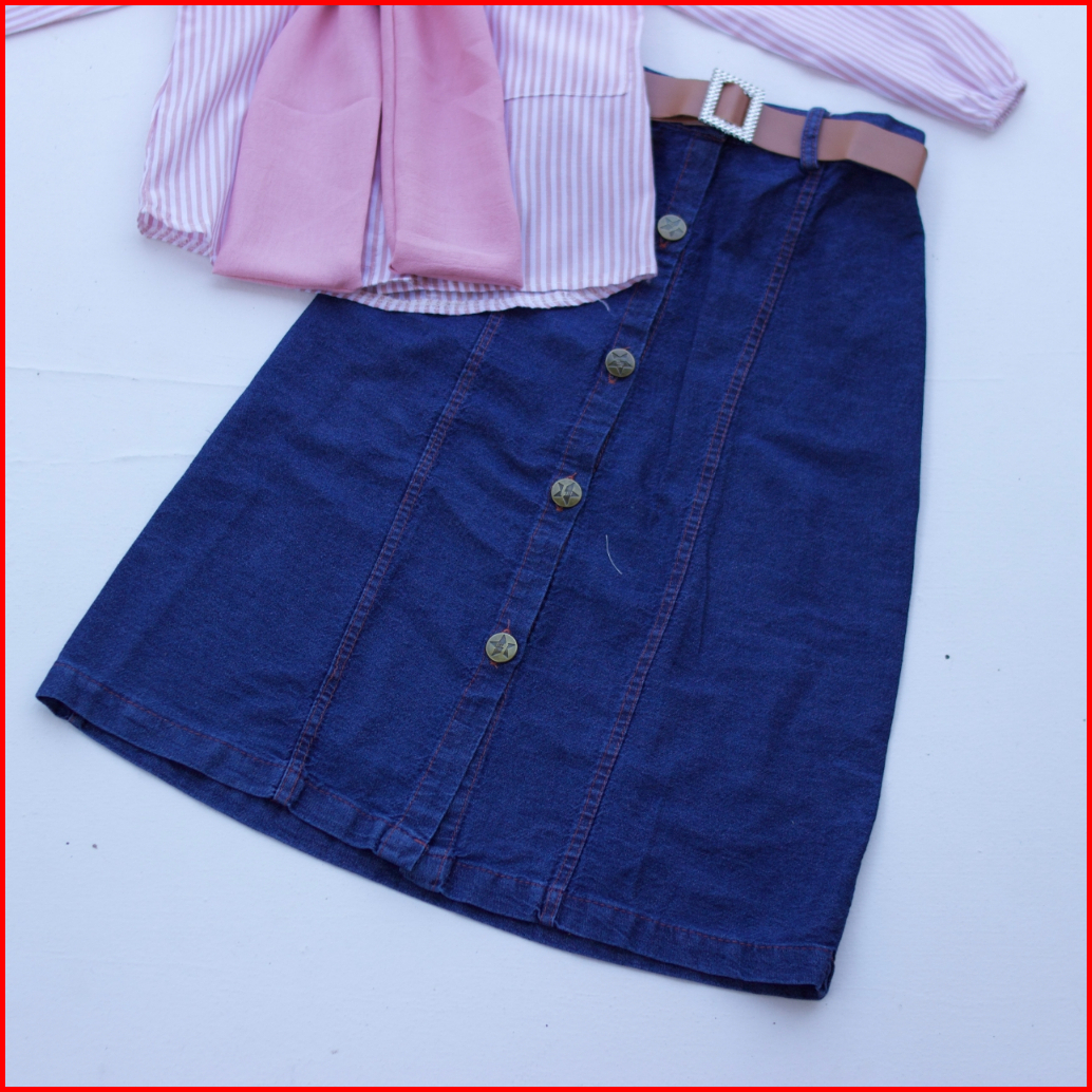Setelan Rok Jeans Anak Lunara I Atasan Kemeja Motif Salur 1-12 Tahun I Oneset Rok Anak Kekinian