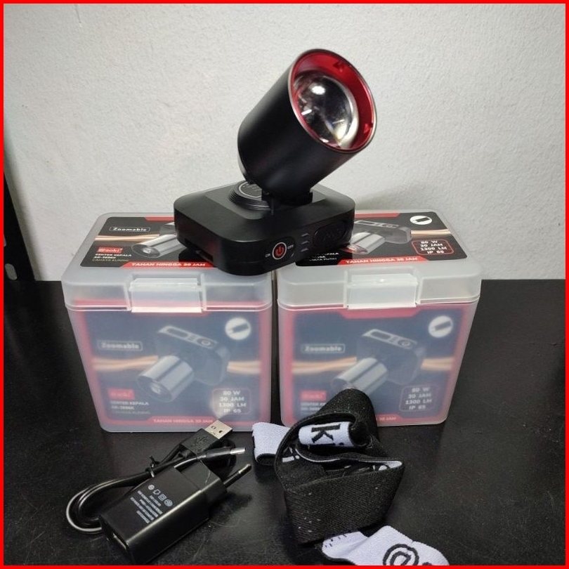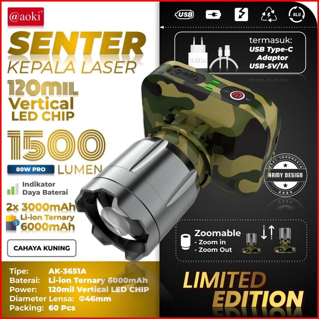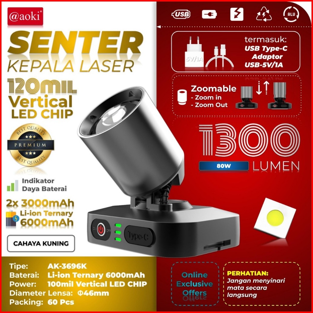 Senter Kepala Led Laser Aoki Ak-3695a 80watt 1300 Lumen Baterai 6000mah - Zoom Jarak Jauh Dengan Indikator Baterai - Wat