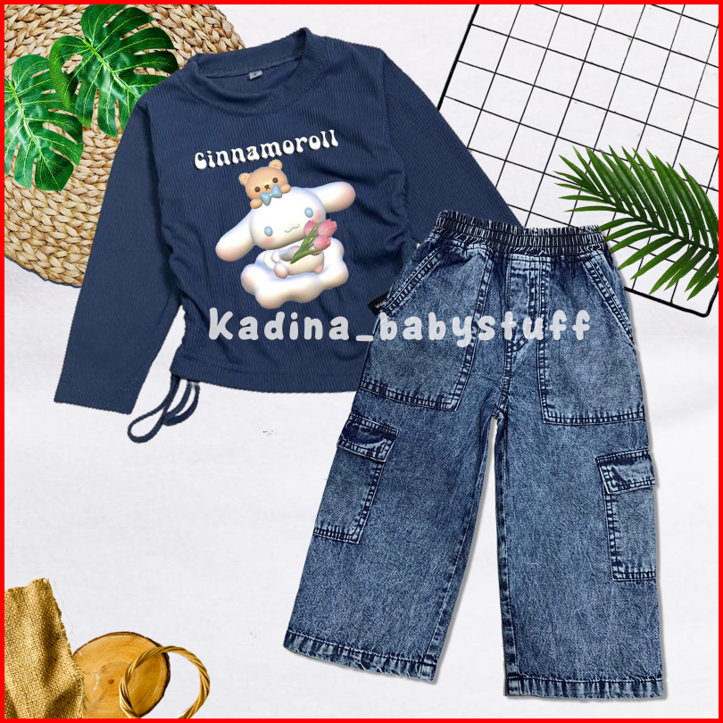 Setelan Jeans Anak Perempuan Kaos Serut Gambar Karakter Lucu Kulot Cargo Jeans
