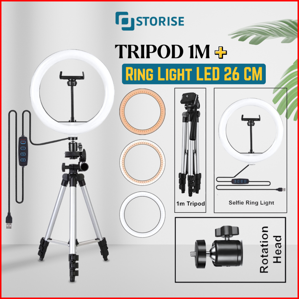 Storise Paket Komplit Tripod 1 Meter Ring Light 26 Cm Stand Hp Stream Selfie Make Up Vlog Lampu