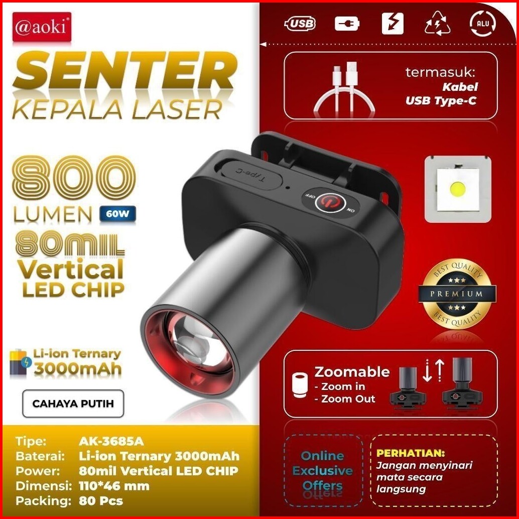Aoki Head Lamp Zoom Cahaya Putih Kuning Aoki Senter Kepala Led Zoom Ak-3685a Ak-3686k 60w Cahaya Super Terang Jarak Jauh