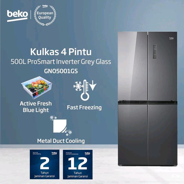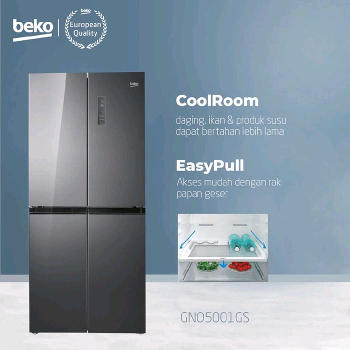 BEKO KULKAS 4 PINTU 500L GNO5001GS – INVERTER, DESAIN DARK GREY GLASS, FITUR CANGGIH