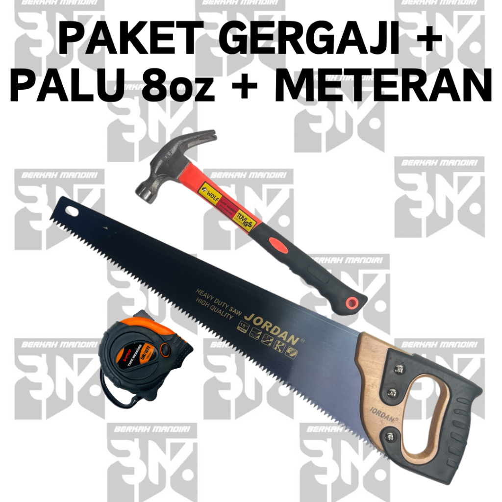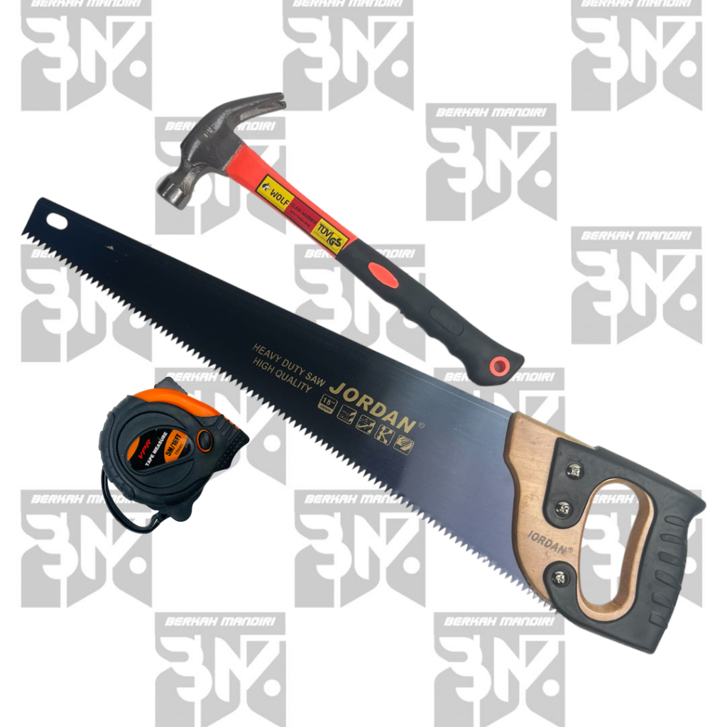 Paket HEMAT Gergaji Kayu Gagang Fiber 18 inch / Gergaji Tukang Meteran 5M Karet Palu Kambing 8oz