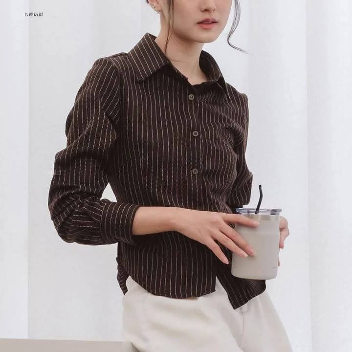 Kemeja Fitted Wanita Stripe Salur Basic Casual Maroon