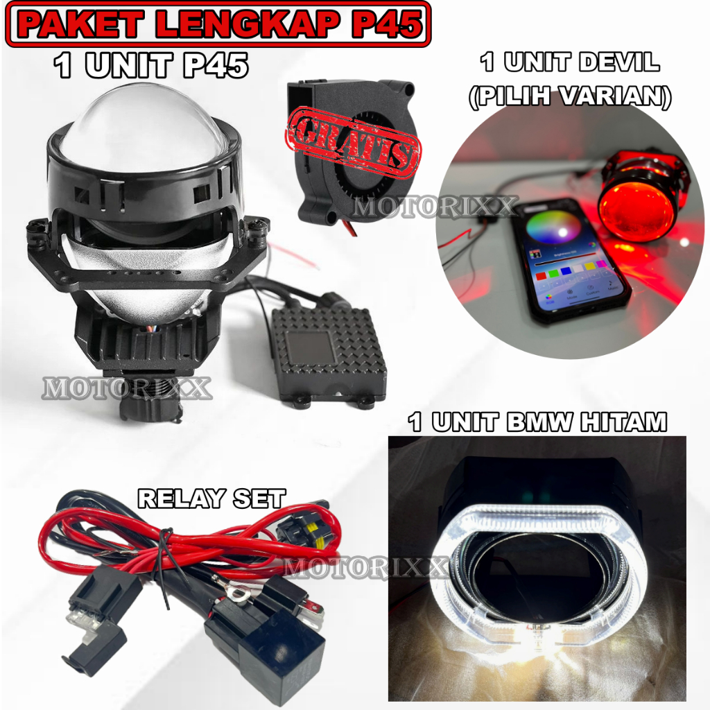 1 PCS P45, 1 UNIT+APPOLO, 1 UNIT+BULAT RGB, 1 UNIT+BMW RGB, 1 UNIT+RING COB, 1 UNIT+MAX RING, 1 UNIT+BMW HITAM