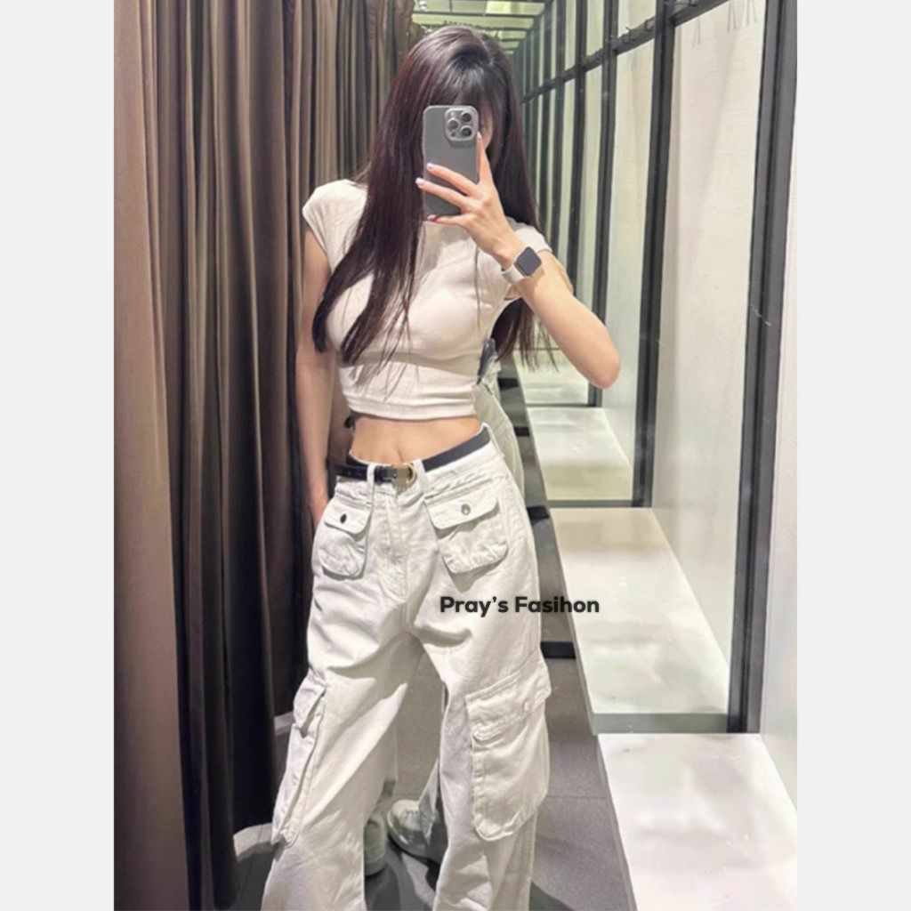 Prays Fashion - Cargo Denim Pasir Putih Highwaist Loose Celana Jeans Wanita Korea(realpict)
