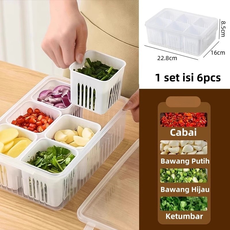 6 Sekat Kotak Penyimpanan Bumbu Dapur Wadah Cabai Bawang Kotak Bumbu Dapur dengan tirisan dan Sekat / Kotak saringan wad