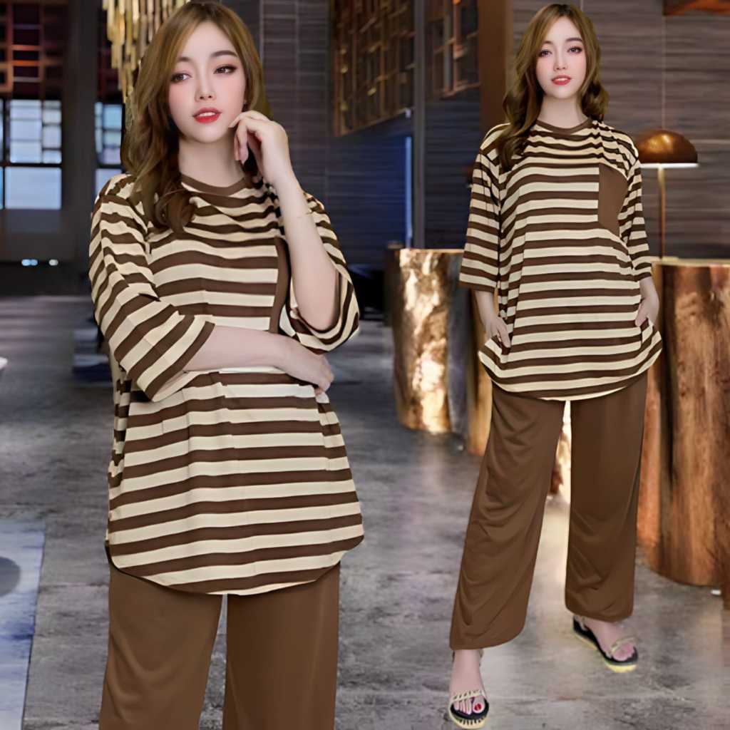 AUFAA ONESET ATASAN OVAL KANTONG DADA LD 120 VISTATERRY MOTIF SALUR celana karet wanita setelan baju basic Panjang Oversize