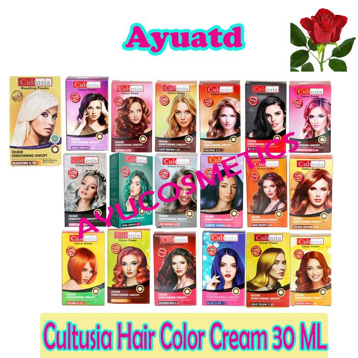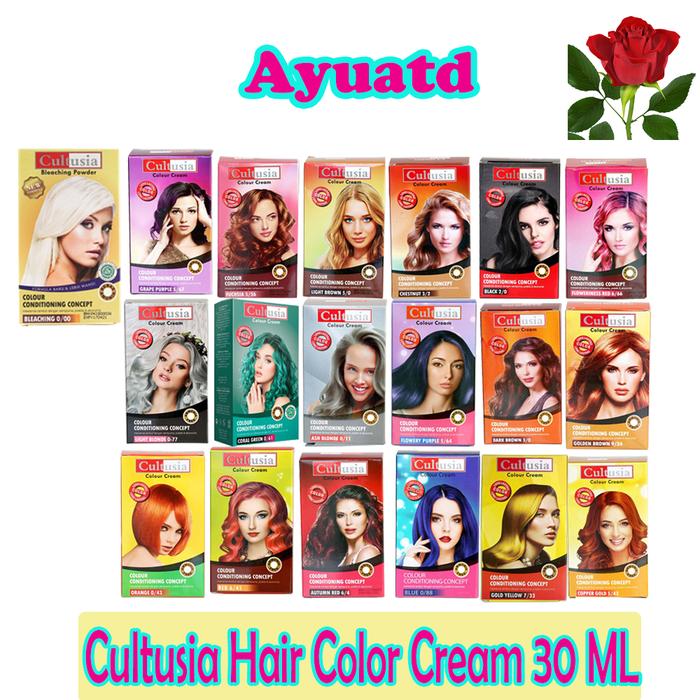 Autumn Red 6/4, Black 2/0, Bleaching 0/00, Blue 0/88, Chestnut 3/2, Coper Gold 5/43, Coral Green 0/61, Drak Brown 3/0, Floweriness Red 6/66, Flowery Purple 5/64, Fuchsia 5/56, Gold Yellow 7/33, Golden Brown 9/34, Grape Purple 5/67, Light Brown 5/0, Orange 0/43, Red 6/45, ash blonde 0/11, light blonde 0/77, mangkok, sisir semir