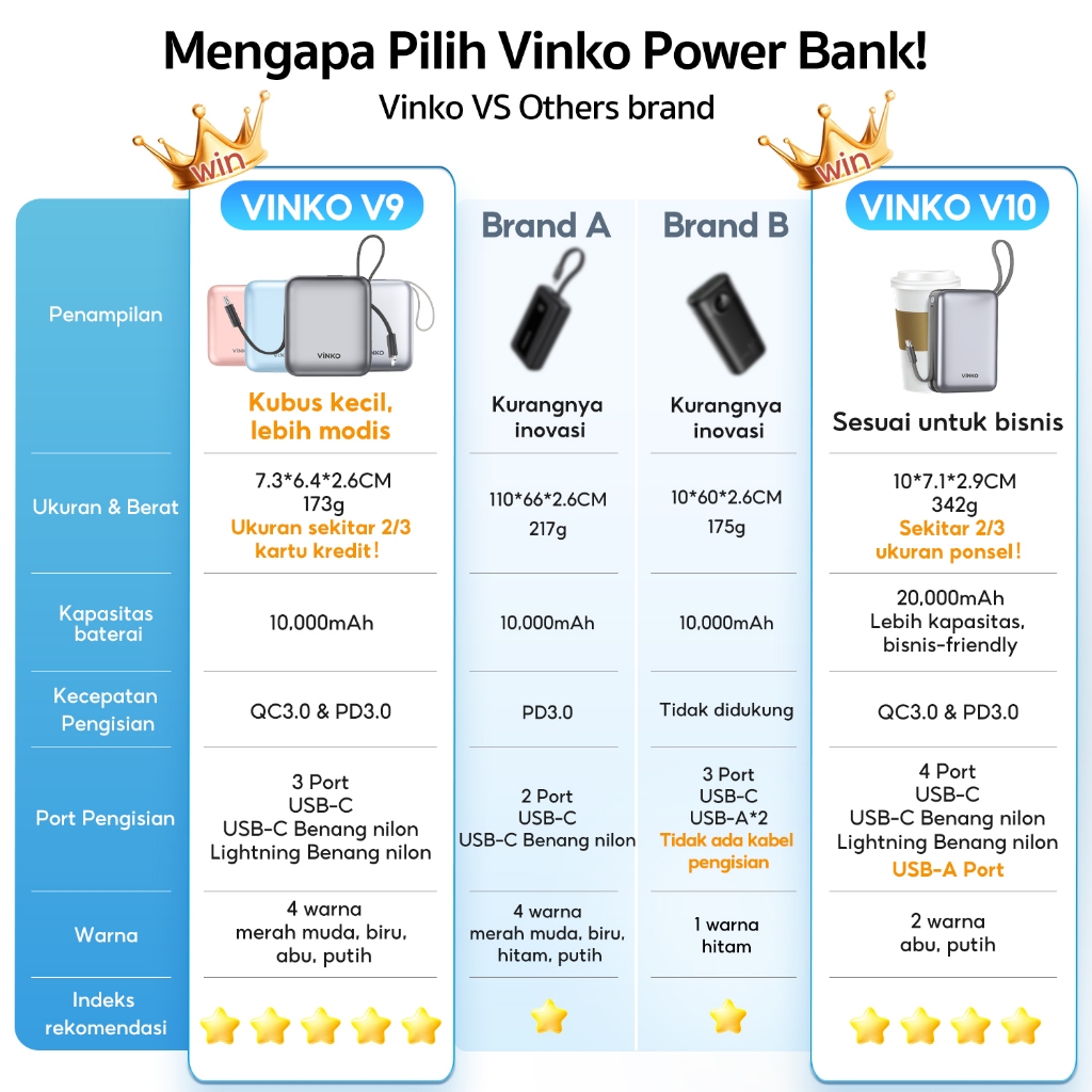[Tersertifikasi CCC] VINKO V9 Pocket Powerbank 10000mAh 22.5W Fast Charging PD 3.0 Power bank With C+L Cable untuk iPhon