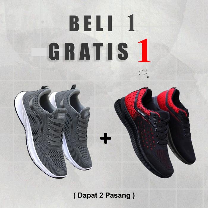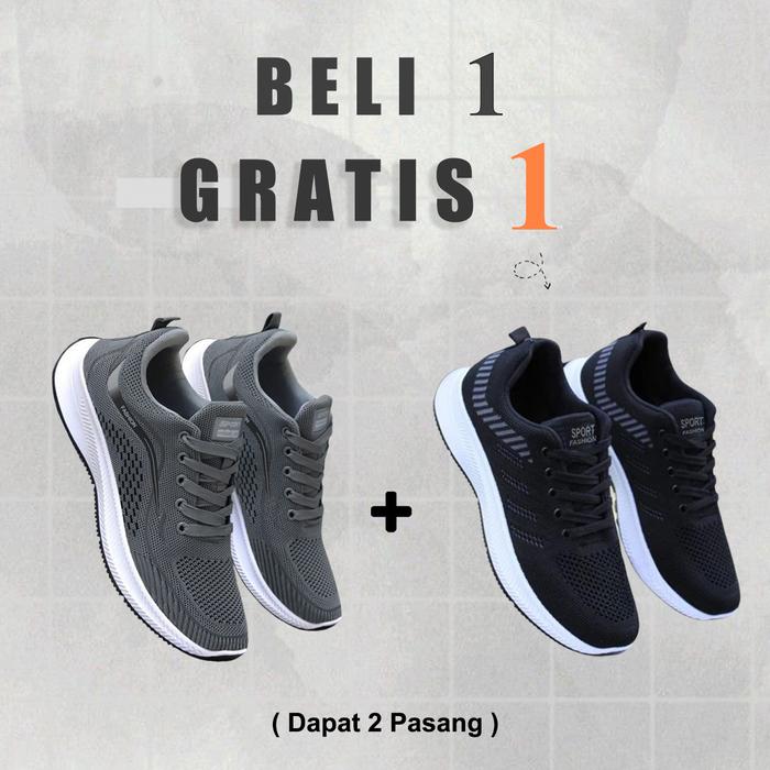 [Star]BUY 1 GET 1 Sepatu Sport Pria Kasual & Trendy Gratis 1 Pasang - BJN HITAM + ID ABU, 39