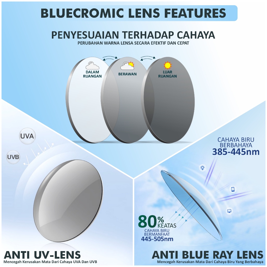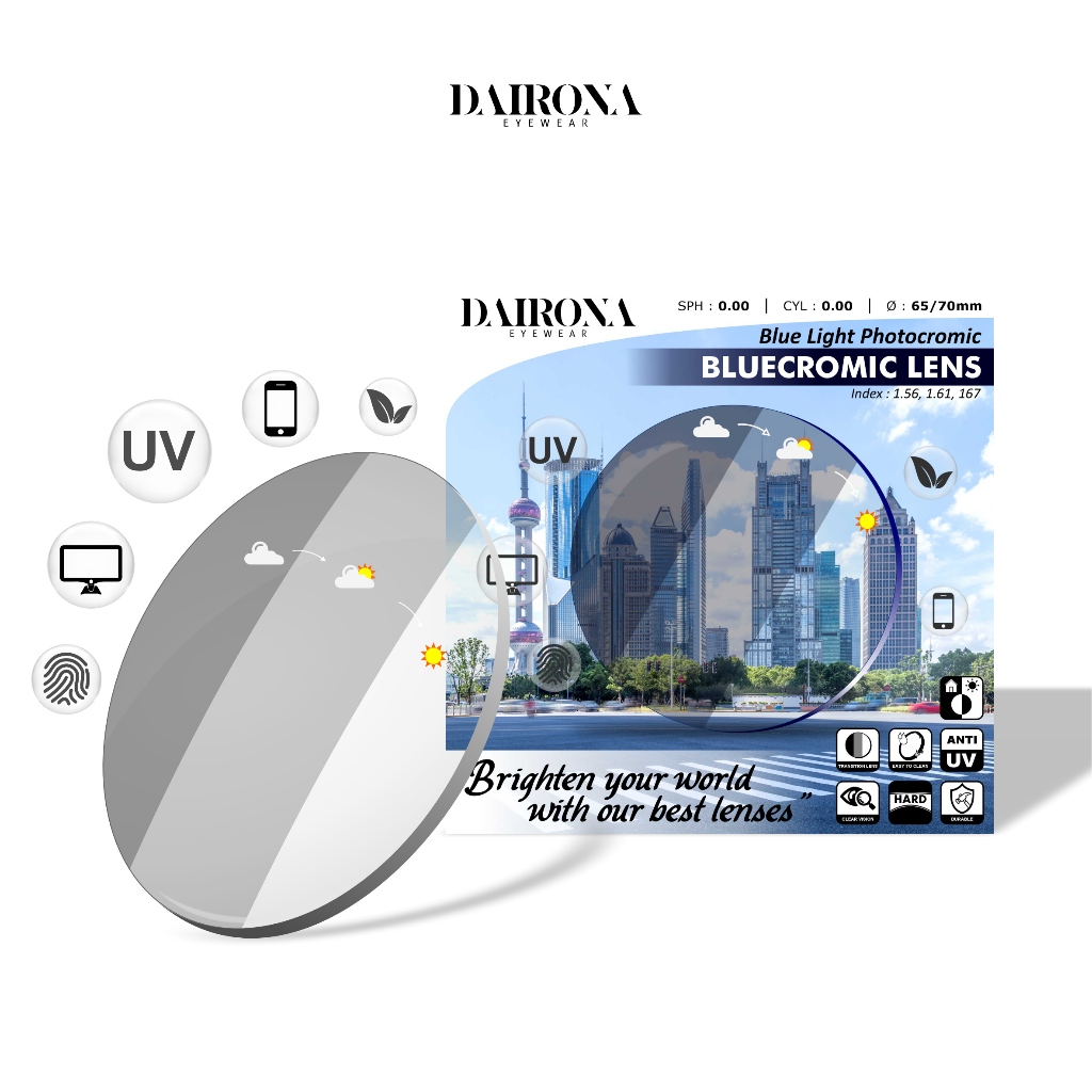 DAIRONA EYEWEAR LENSA KACAMATA BLUECROMIC ABR PGX ANTI RADIASI+BLUERAY+PHOTOCROMIC MINUS/PLUS 1.56,1.61 & 1.67 ANTI SILAU BLUECROMIC K004