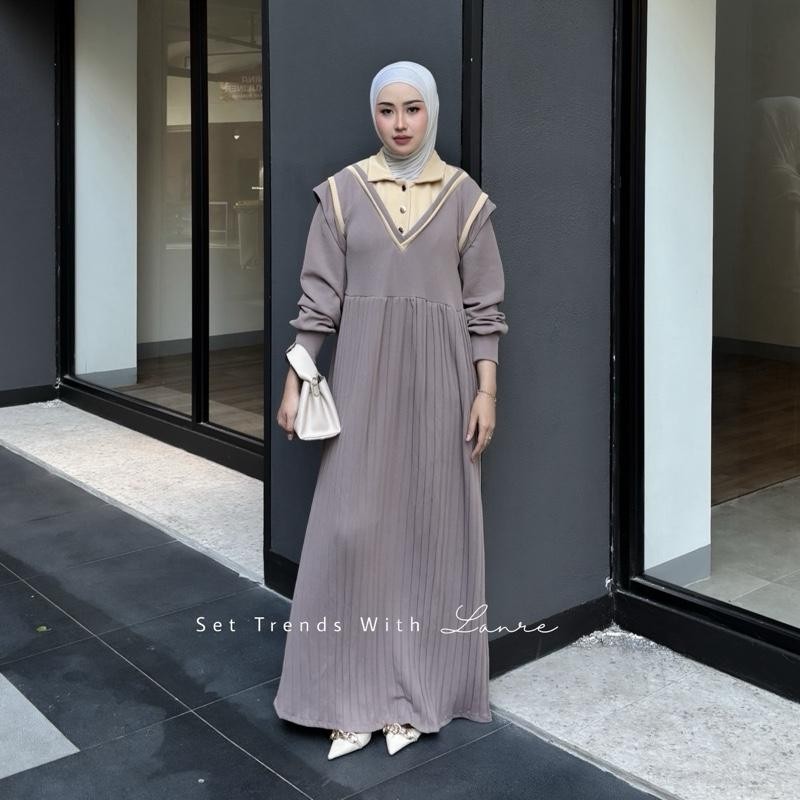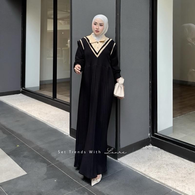 Geby Dress Knit Muslimah Casual Elegan - Gamis Pleated Lengan Panjang Bisa Untuk Busui