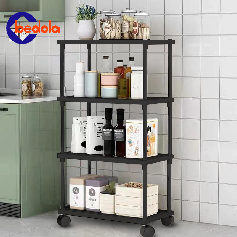 Rak dapur plastik acsthetic rak susun rak serbaguna rak panci putih 4 layer dengan roda free 3 kait