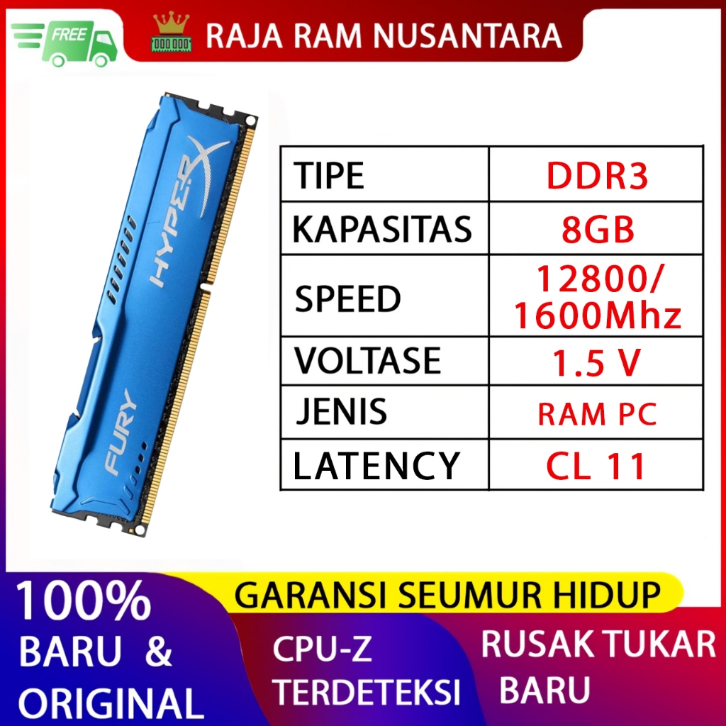 RAM PC KINGSTON HYPERX FURY GAMING DDR3 8GB PC 12800 / 1600 MHz RAM KOMPUTER 1.5v 8GB