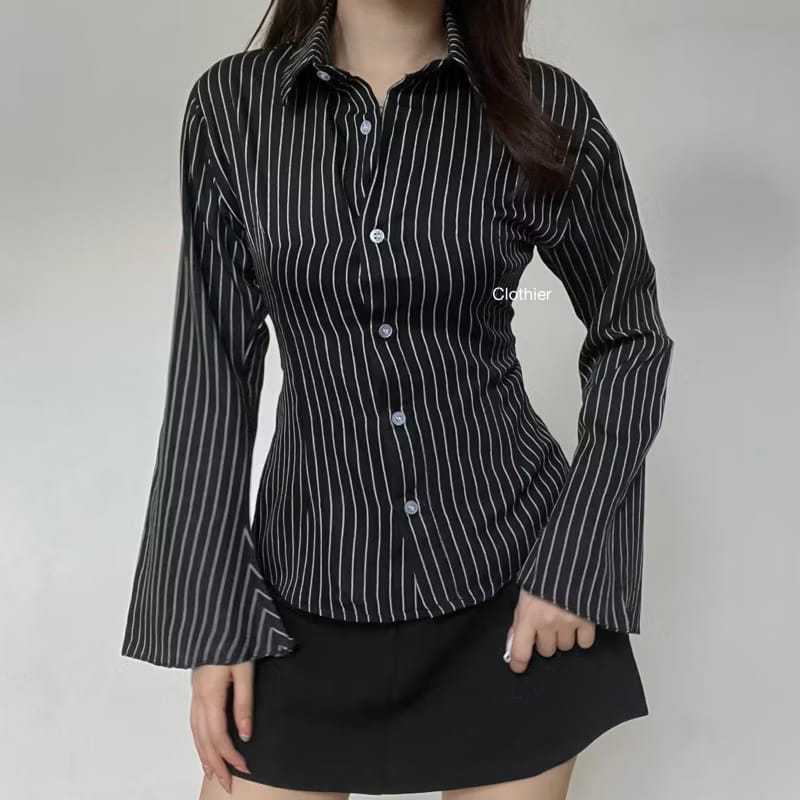 Kemeja Whispie Atasan Wanita Motif Salur Garis Stripe Slim Fit Body – Lengan Flare Elegan, Kekinian