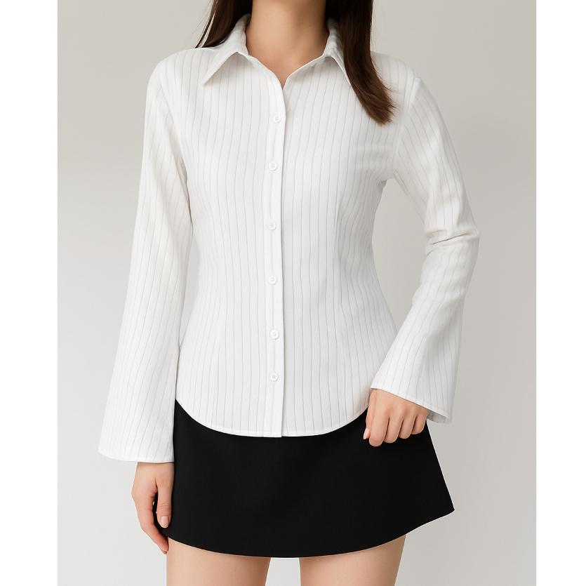 Kemeja Whispie Atasan Wanita Motif Salur Garis Stripe Slim Fit Body – Lengan Flare Elegan, Kekinian