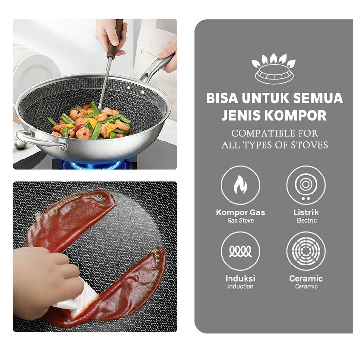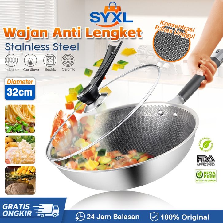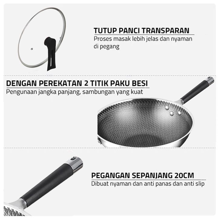 [Star] Wajan Penggorengan Anti Lengket Wajan Stainless Steel Teflon Masak Gagang Struktur Sarang Lebah Dengan Penutup