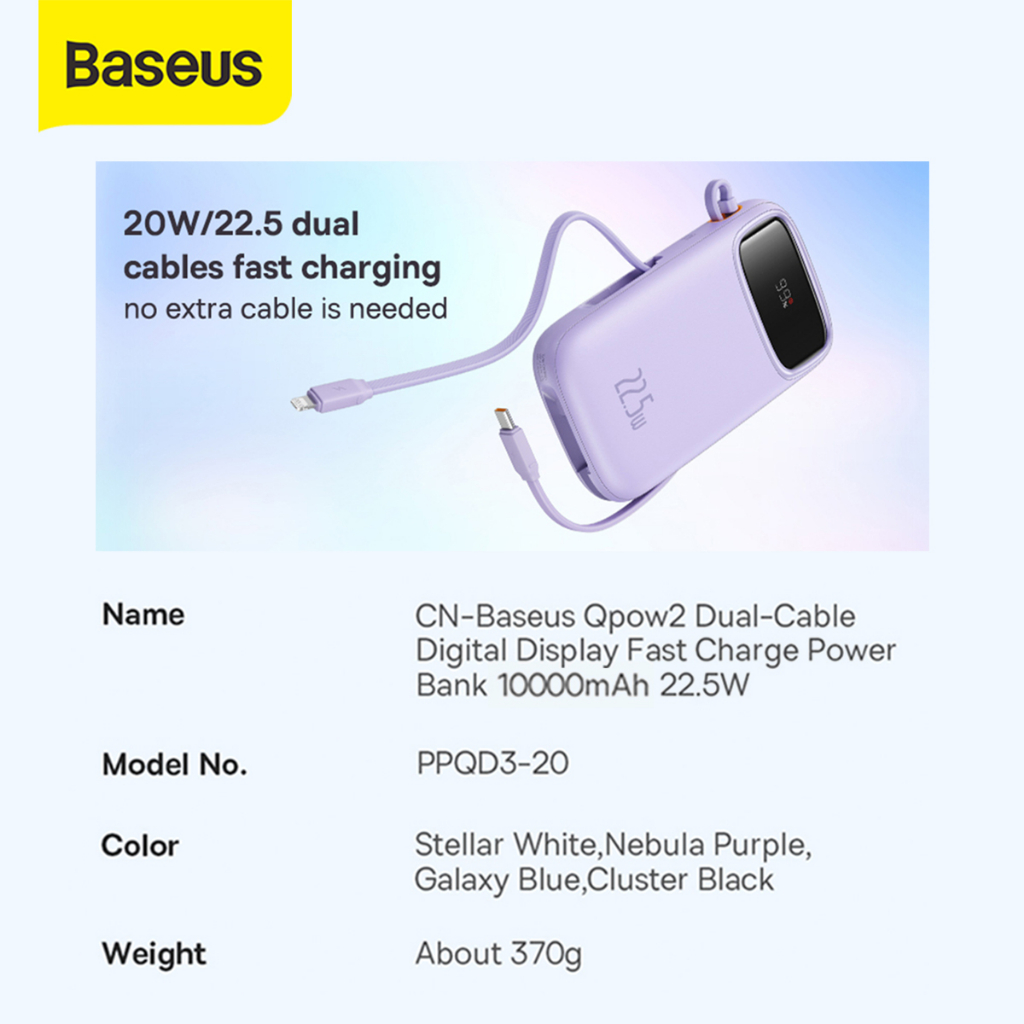 Baseus Qpow2 22.5W Fast Charging Power Bank Dual-cable Type-C PD QC SFC