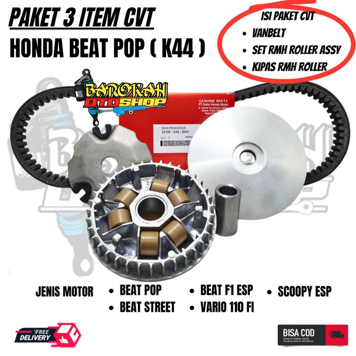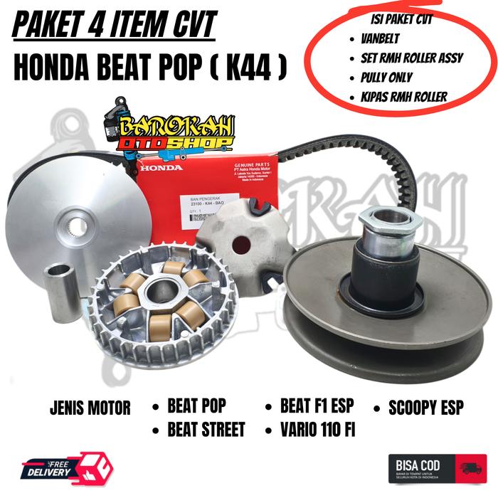 PAKET KIRI CVT 4ITEM K44 PULLY ONLY BEAT POP + KIPAS RUMAH ROLLER + RUMAH ROLLER SET + VANBELT BEAT POP / VARIO 110 F1 /