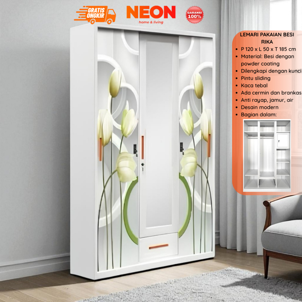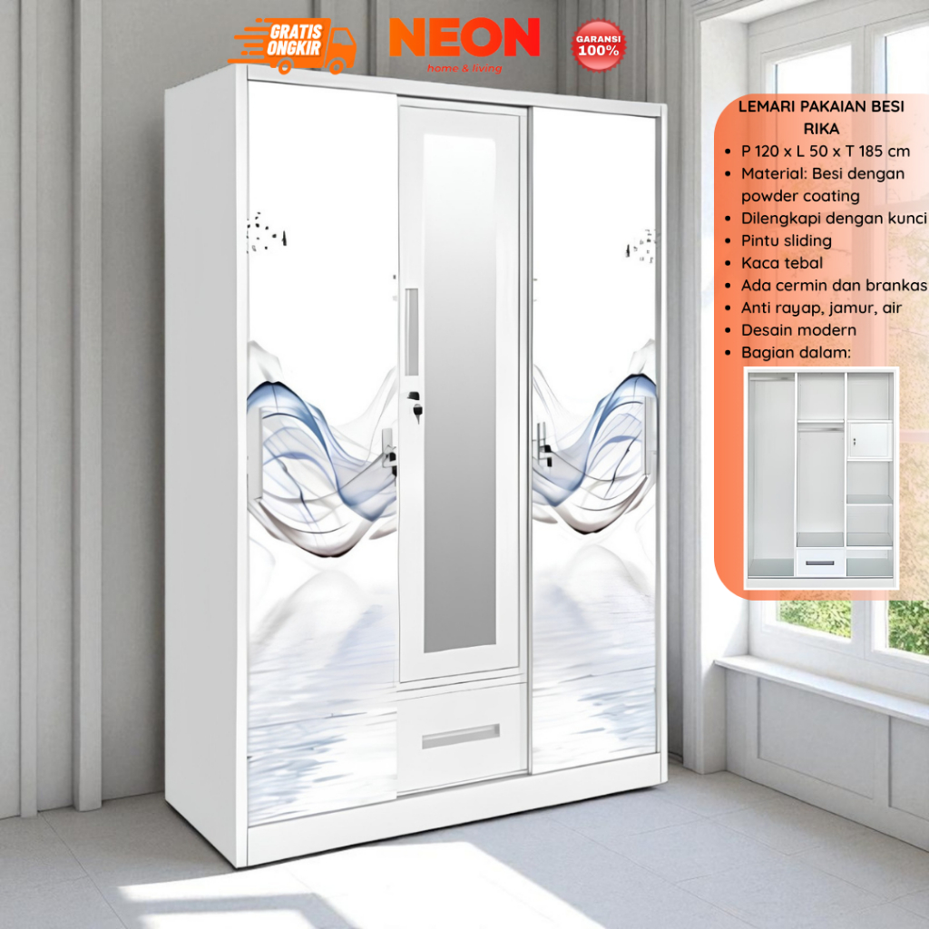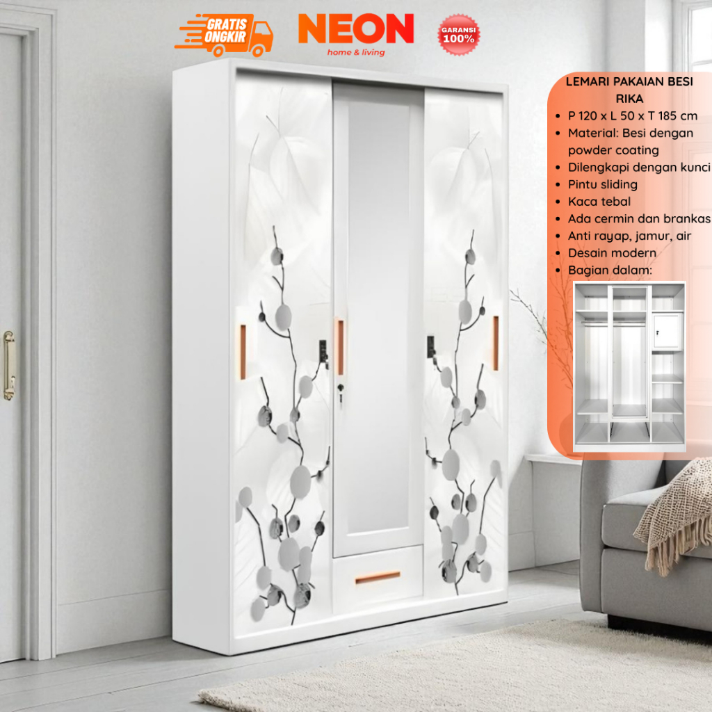Lemari Pakaian Besi Rika Sliding 3 Pintu Minimalis Murah Anti Rayap | Lemari Baju Sleding NEON Gratis Ongkir