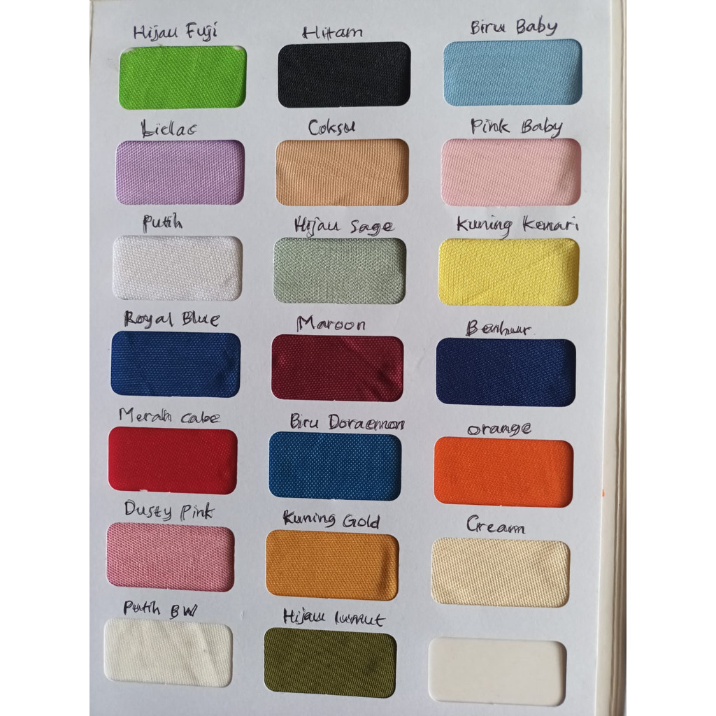 Putih, Putih Bw, Coklat Susu, Hitam, Silver, Lilac (Violet), Biru Baby (langit), Dusty Pink, Benhur, Doraemon, Cream, Hijau Sage Muda, Salem, Hijau Lumut, Orange, Hijau Fuji, Baby Pink (Rose), Maroon, Hijau Mint, Kuning Gold, Kuning Kenari, Royal Blue, Coklat Kopi, Mocca, Hijau Super, Denim, Hijau Sage Tua, Merah Cabe, Batik Putih, Batik Coksu, Batik Silver, Batik Gold, Batik Hitam, Navy/Dongker, Burgundy, Ungu Anggur, Putih Super