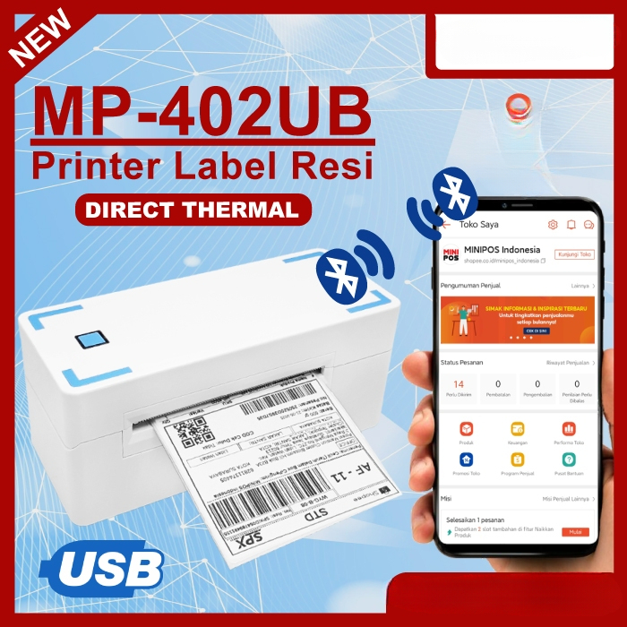 Printer Thermal 110mm 4in Bluetooth MP-402UB USB Cetak Resi A6 Shipping Shop Label ga