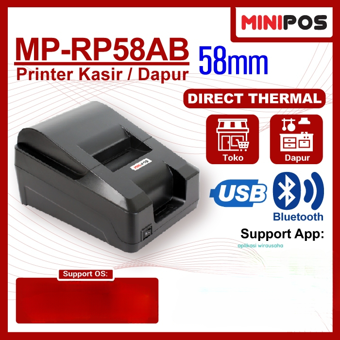 Printer Thermal 58mm Bluetooth MP-58AB USB Kabel Premium Glossy Head Thermal Jepang Adaptor Awet