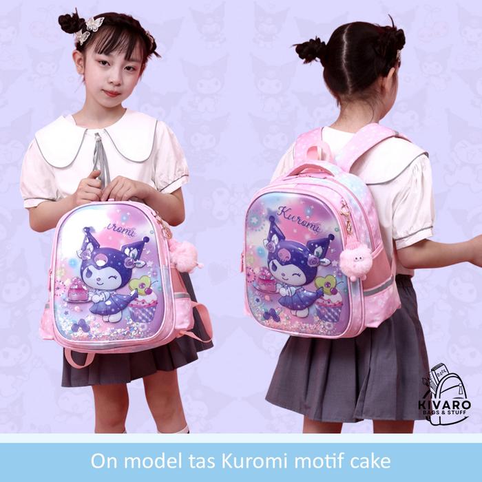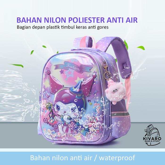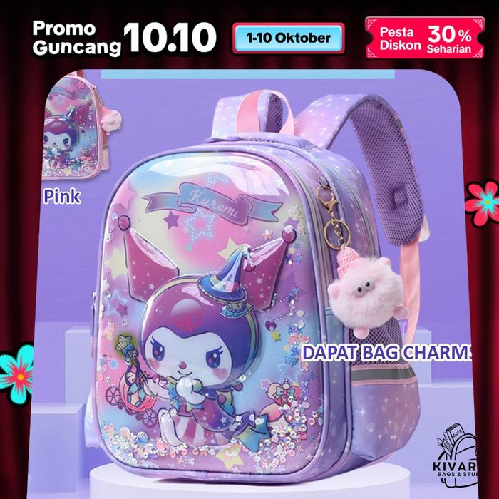 FREE GANCI Tas Sekolah Anak SD Kuromi 3D Perempuan 35cm Glitter + Bonus Bag Charms Cantik 0889